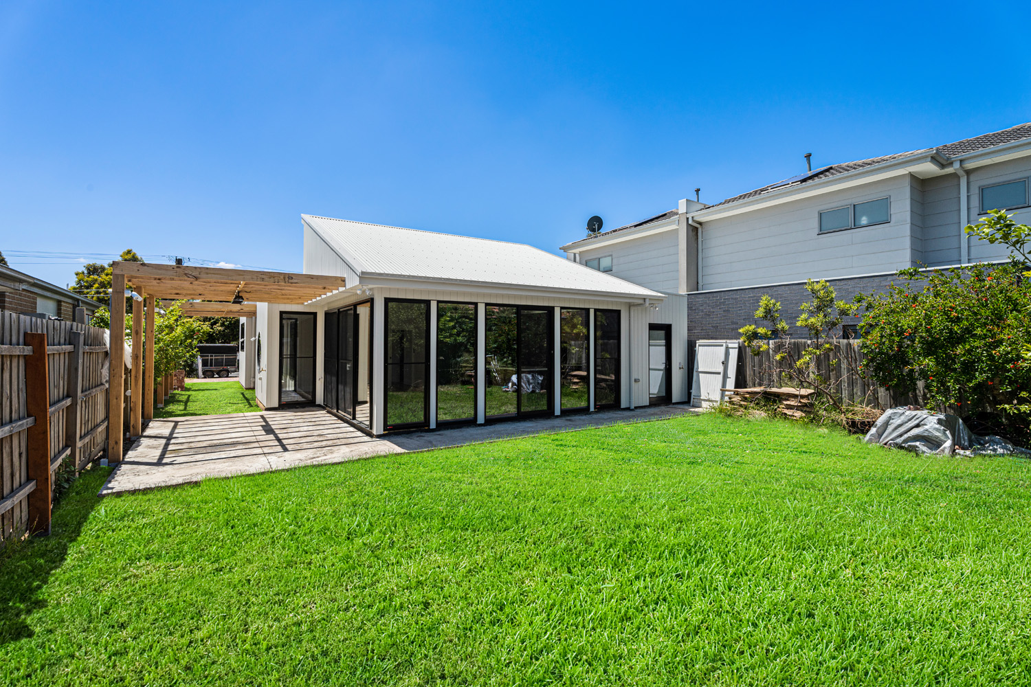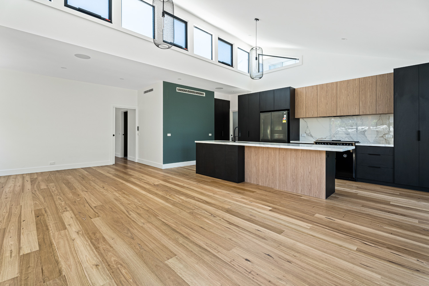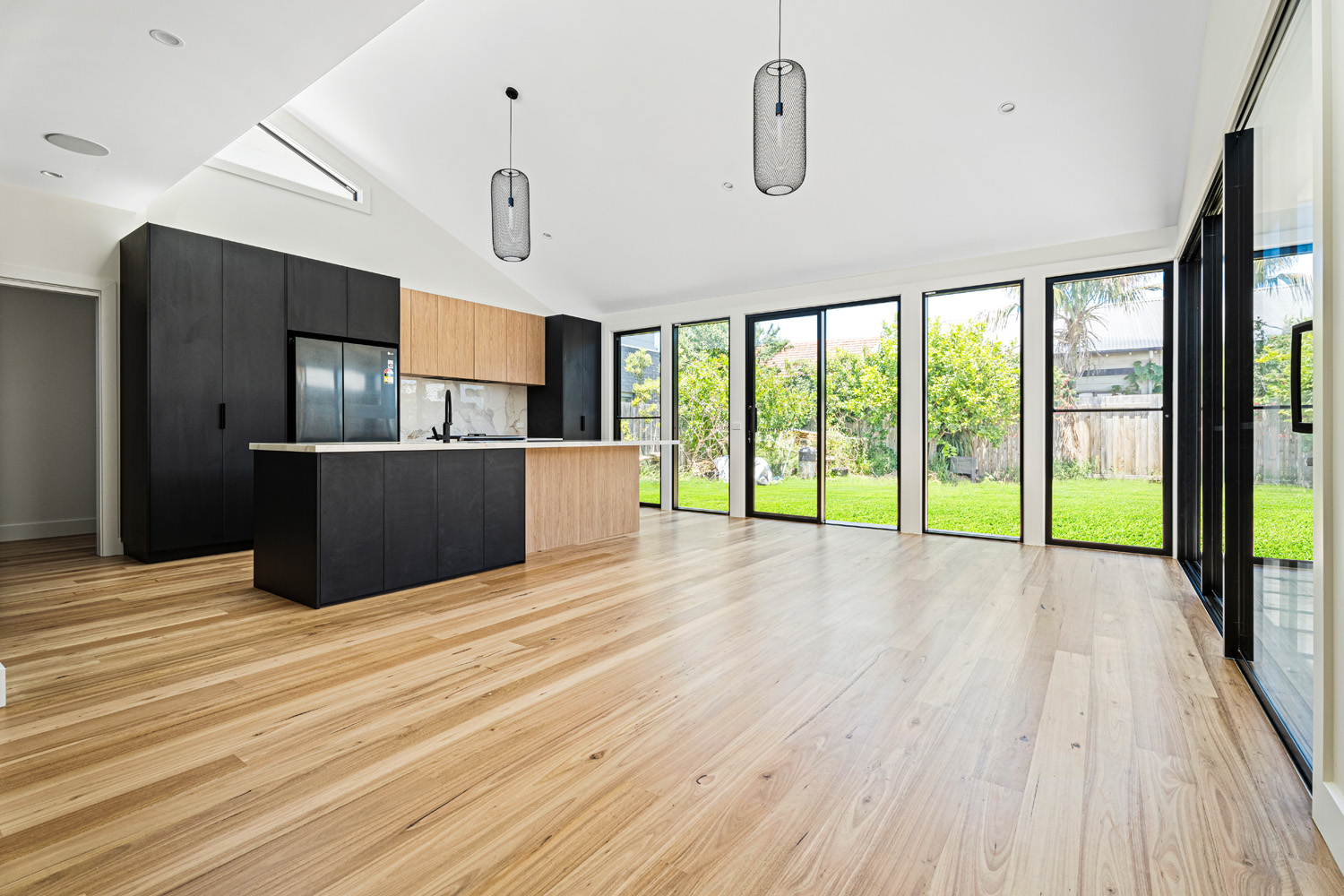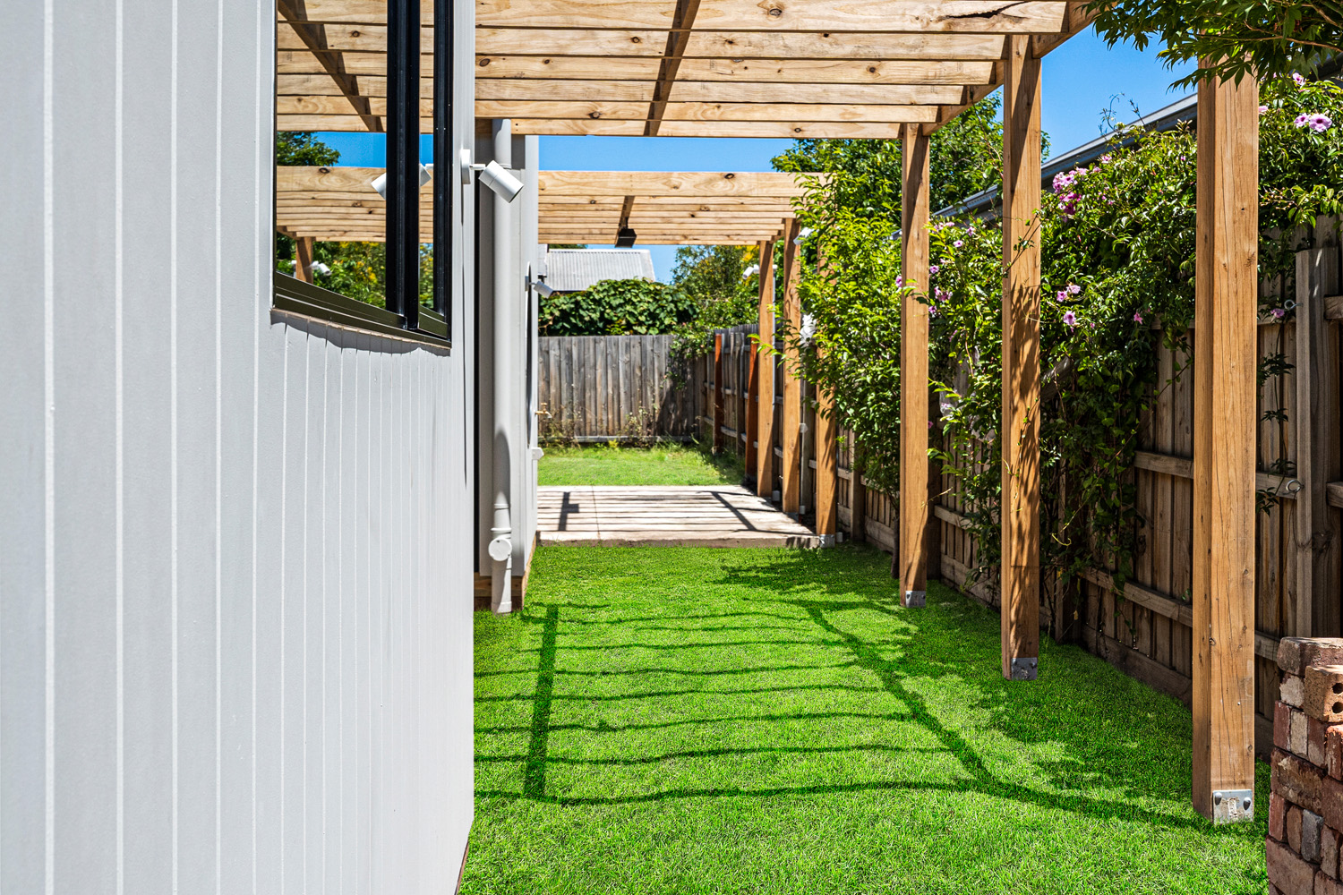 4-bed, 2-bath custom build with porthole window and glass feature brick wall.